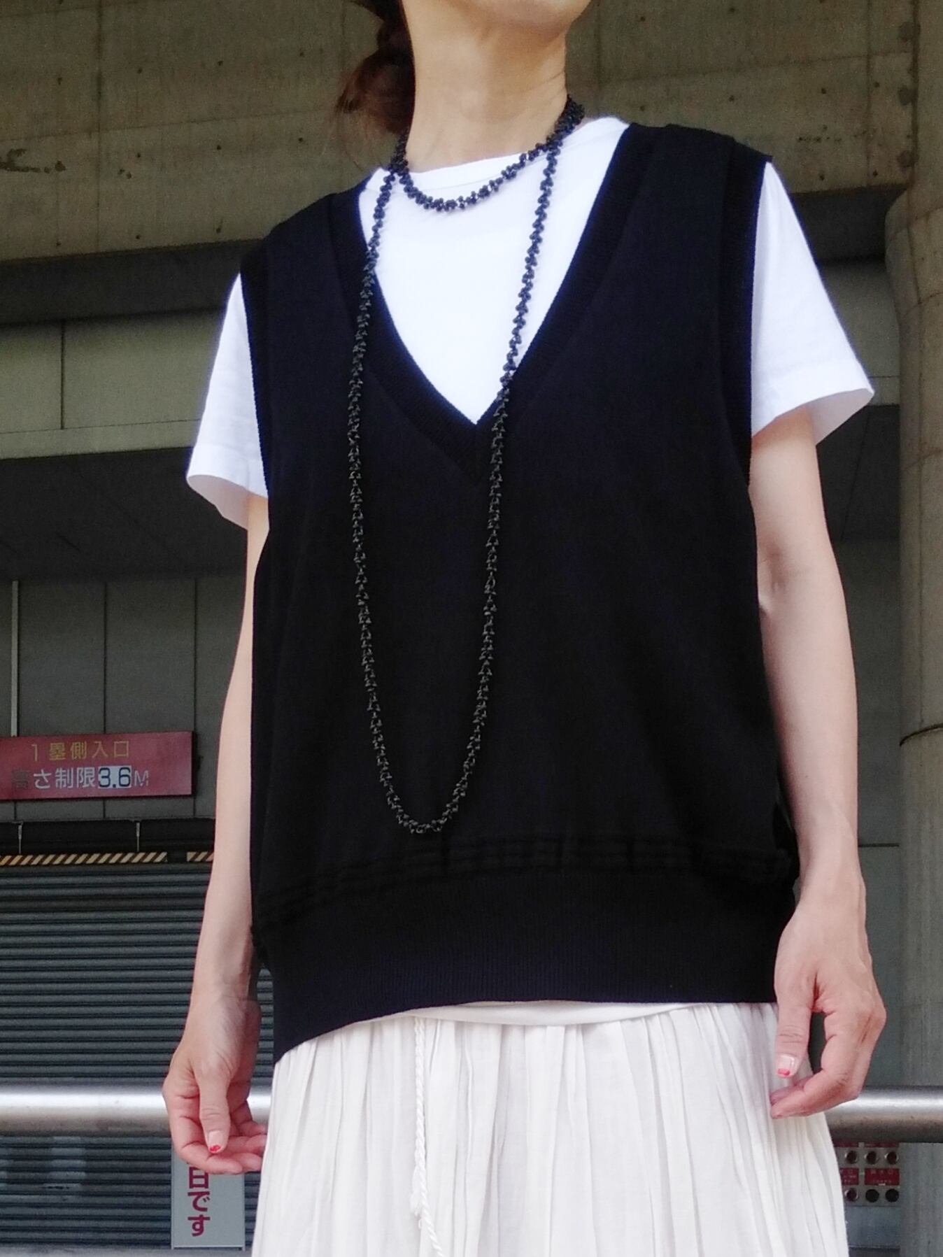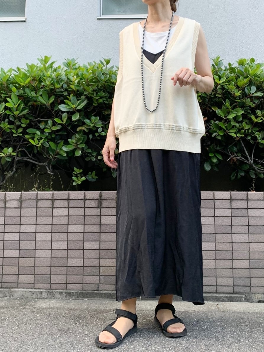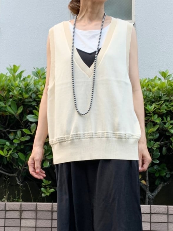 深く開いたVネックが大人っぽい着こなしにしてくれるニットベストです。